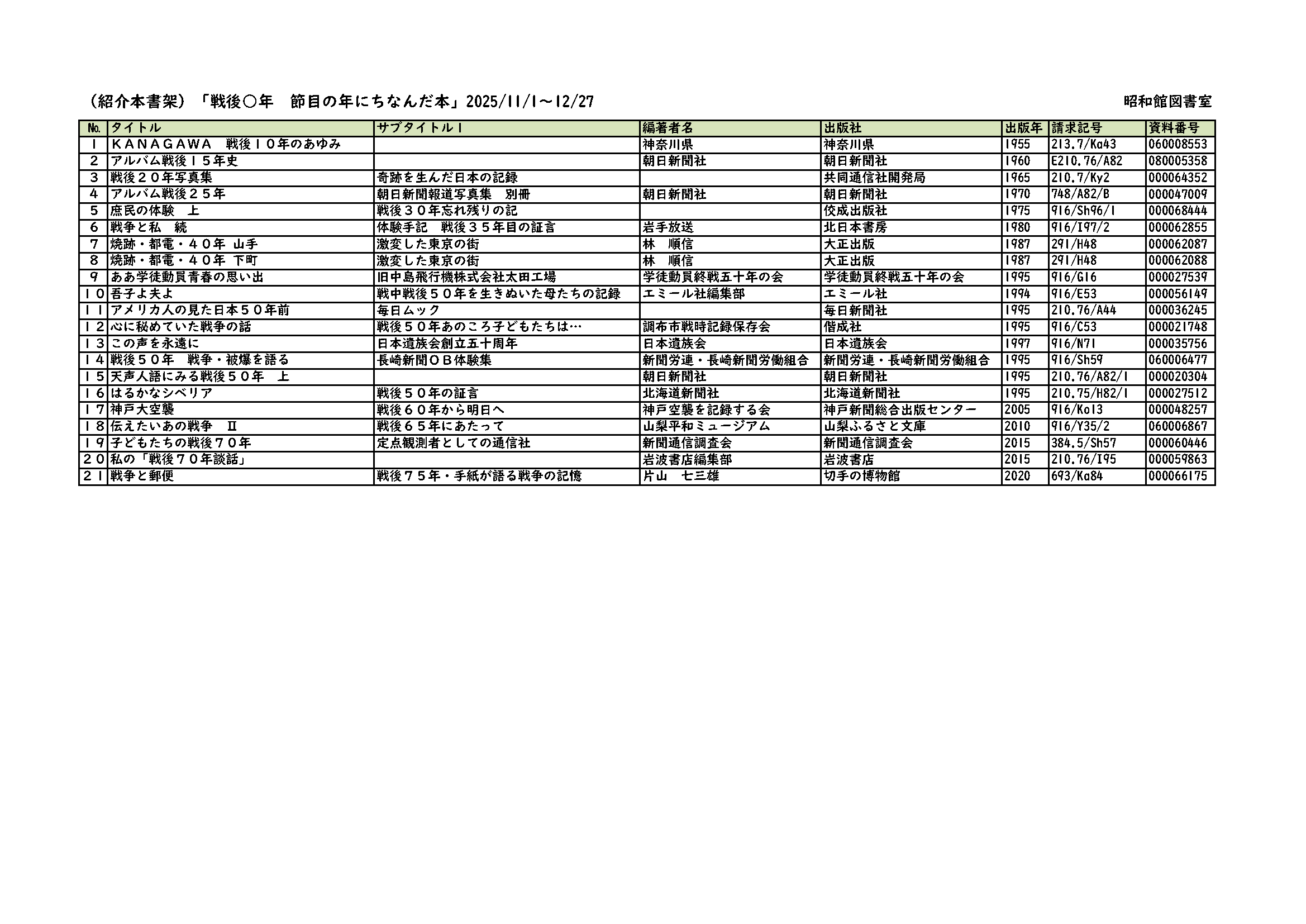 昭和館図書室では、「戦後○年 節目の年にちなんだ本」をテーマに資料を紹介しています。