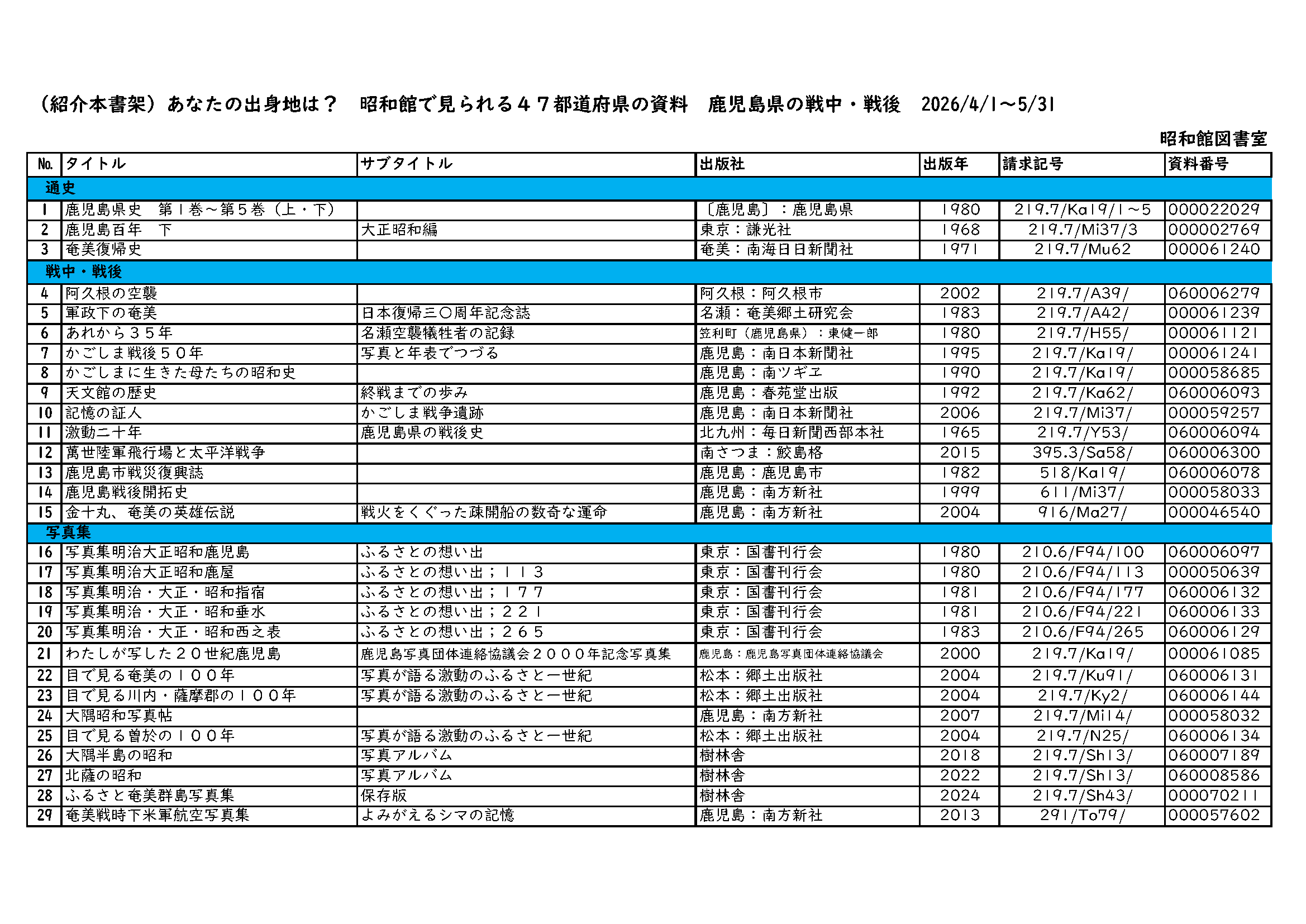 昭和館図書室では、都道府県ごとに、戦中・戦後の関連資料を順次紹介しています。現在は、「鹿児島県の戦中・戦後」を紹介しています。ぜひご利用ください。